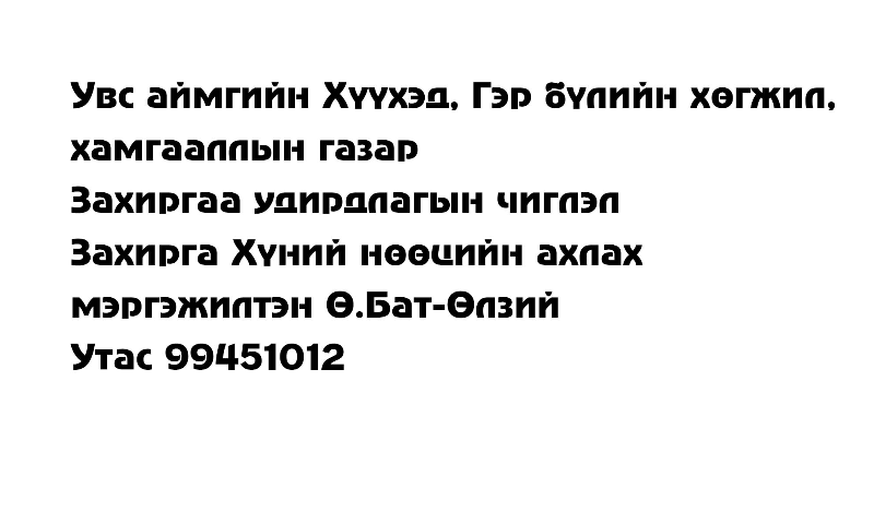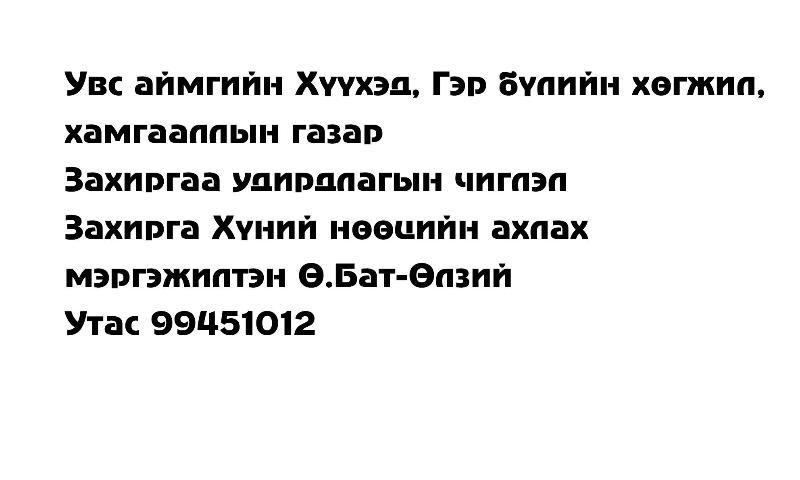 хаяг Монгол улс, Увс аймаг, Улаангом хот, Увс нуур төвийн 3 давхар 303 тоот:
